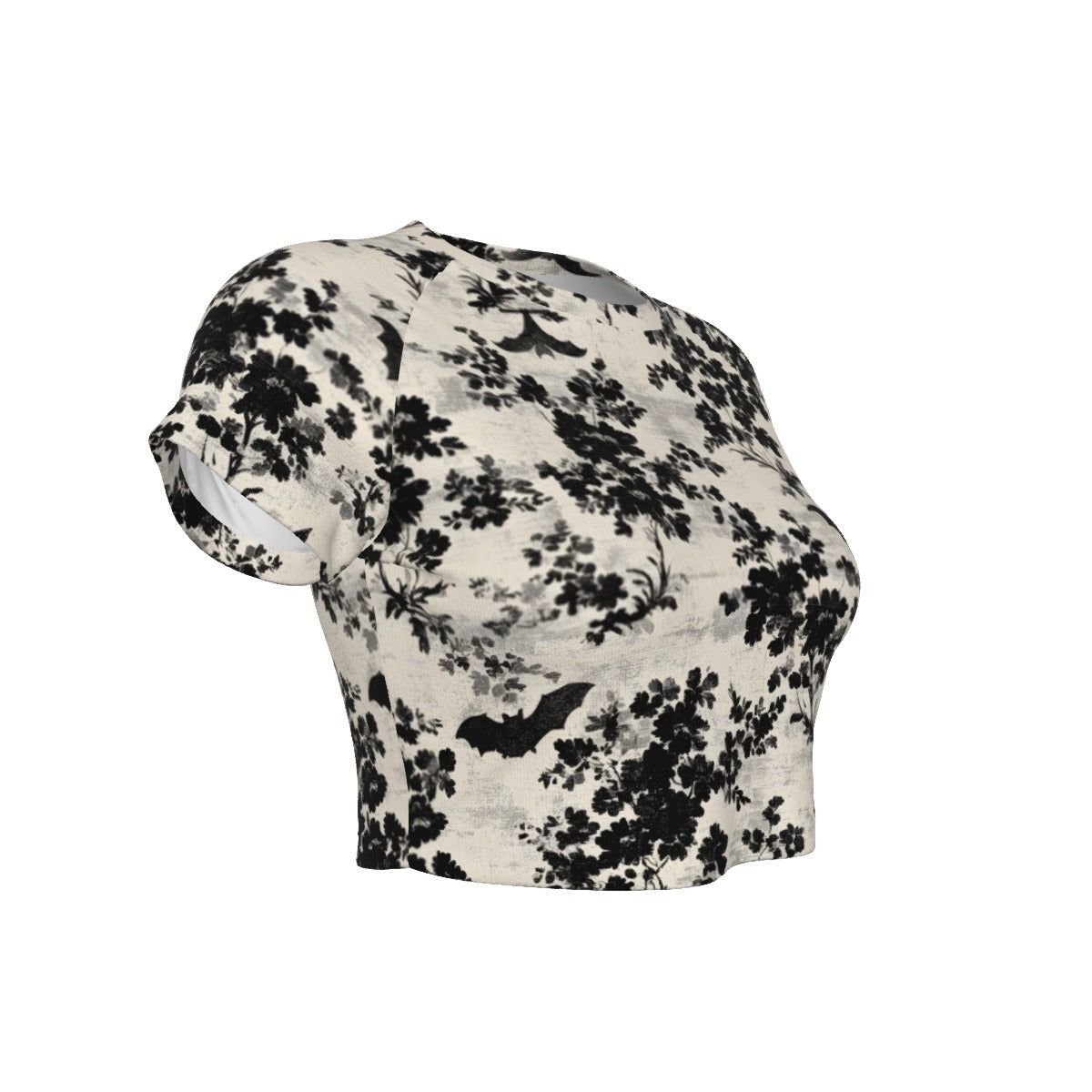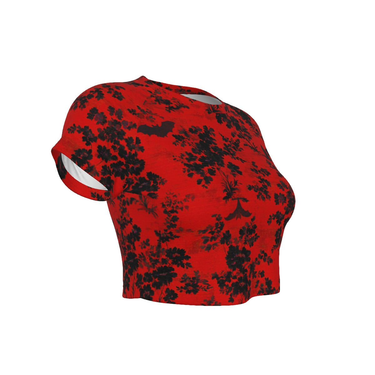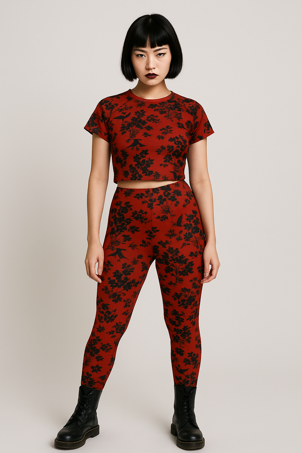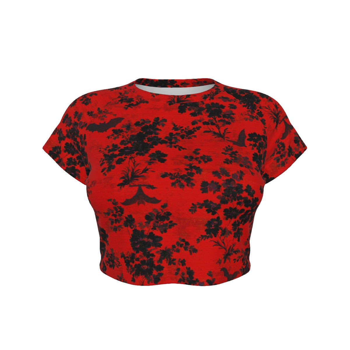 This crop top and leggings combo features a bold damask-inspired bat-and-floral print, and comes in two striking colorways: blood red with jet black detailing, and bone white with shadowy black floral and bat accents.