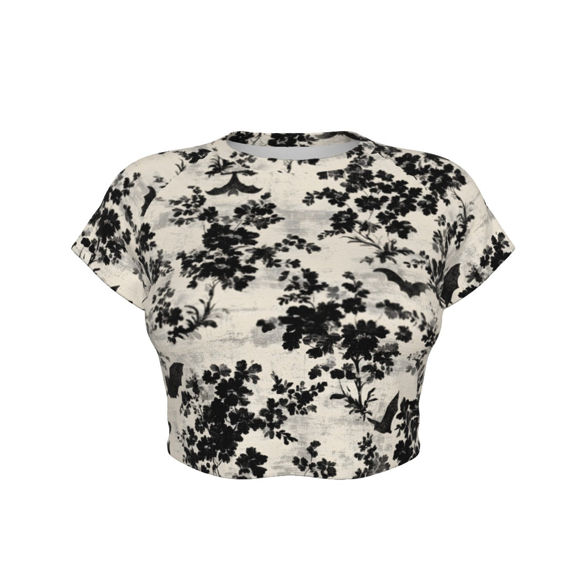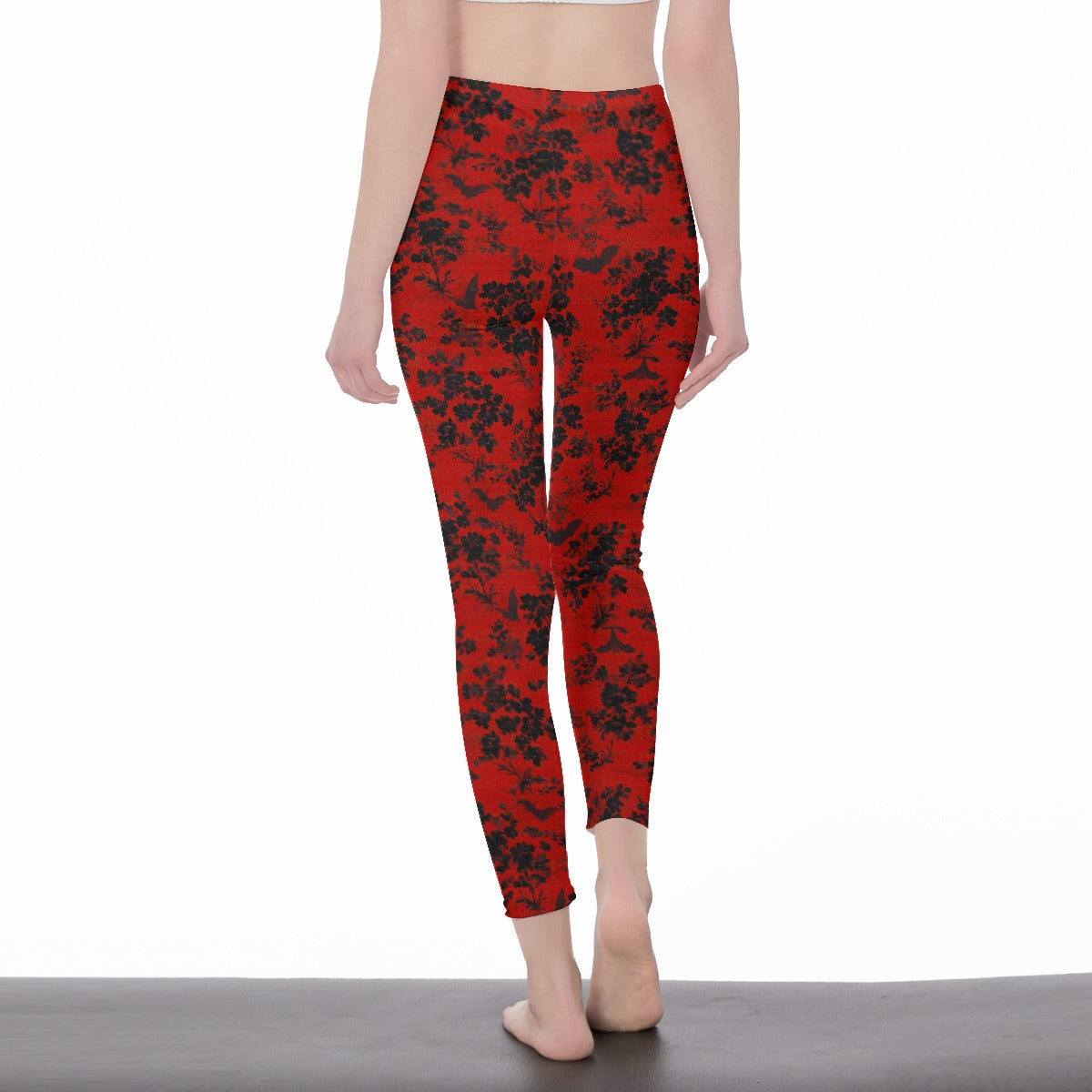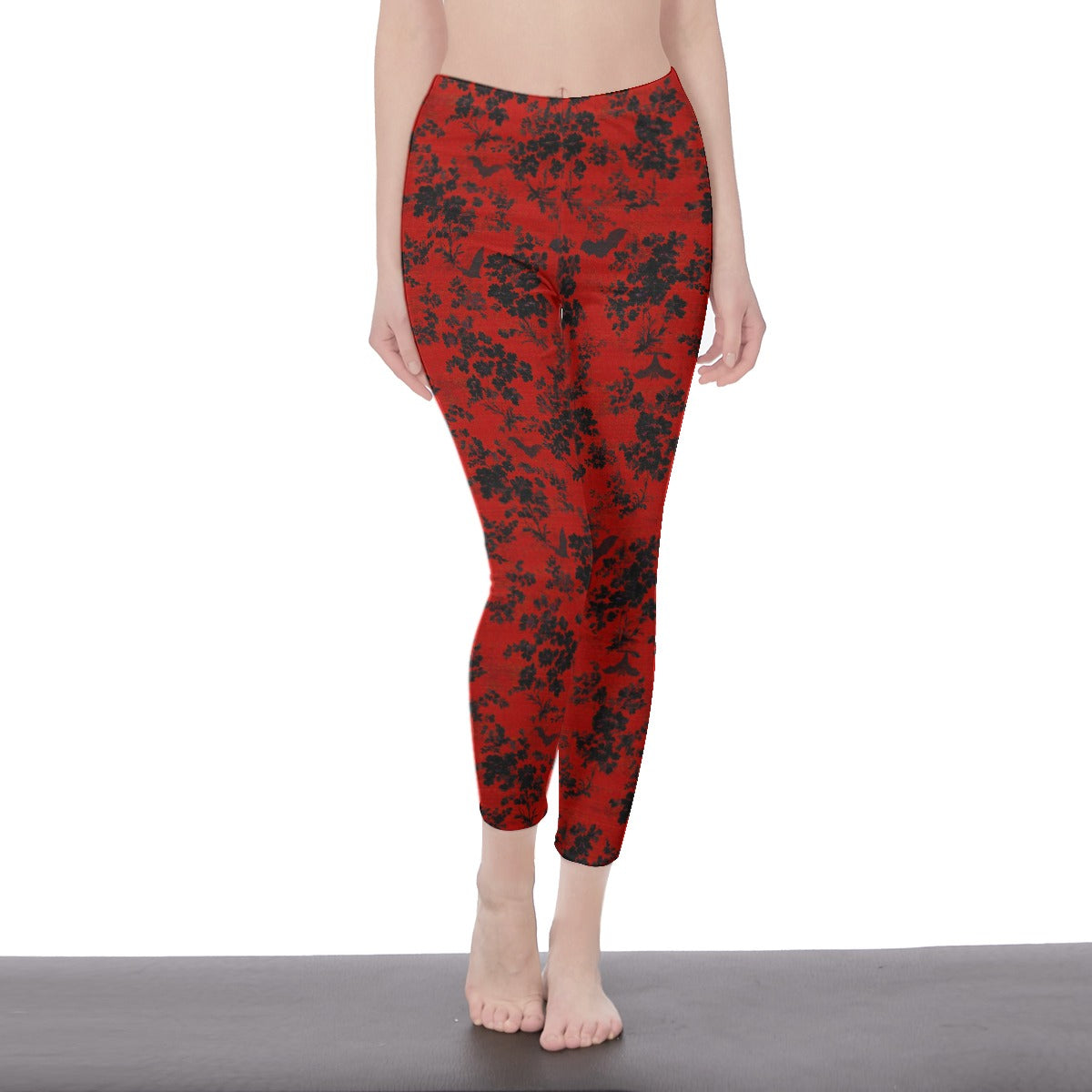 This crop top and leggings combo features a bold damask-inspired bat-and-floral print, and comes in two striking colorways: blood red with jet black detailing, and bone white with shadowy black floral and bat accents.